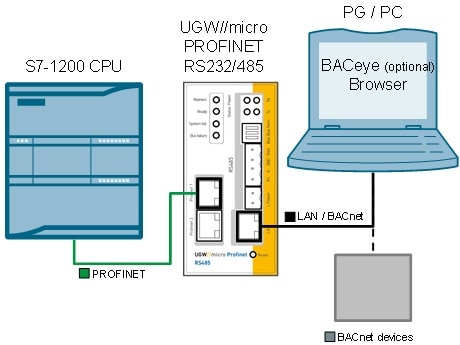 در دیاگرام زیر، اجزای اصلی راهکار برای ارتباط بین CPU سری S7-1200 و گِیت‌وی UGW/micro PROFINET RS232/485 ساخت شرکت MBS GmbH نمایش داده شده است.